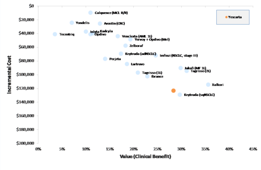 We have analyzed several CAR-T therapies through the lens of our Disease Target Assessment (DTA) framework, which provides (1) an objective and comparable basis for quantifying the magnitude of clinical improvement offered by a therapy, and (2) a measure of clinical benefit compared to price – is the benefit/cost ratio similar to other new oncology drugs that have achieved good market access?