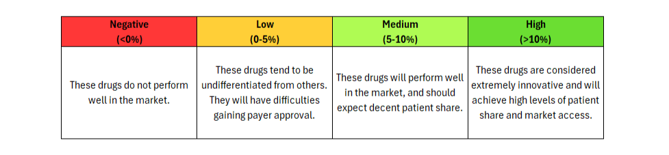 Even though little separates Leqembi from Aduhelm in our framework, Leqembi has managed to achieve modest sales – around $10.1 million in 2023, still well below the original Eisai projections of $28 million for the year.[3] This is despite the fact that the Institute for Clinical and Economic Review (ICER) deemed its current annual WAC price of around $26,000 to offer low long-term value for money, suggesting a more appropriate price is around $10,000 annually.[4]
