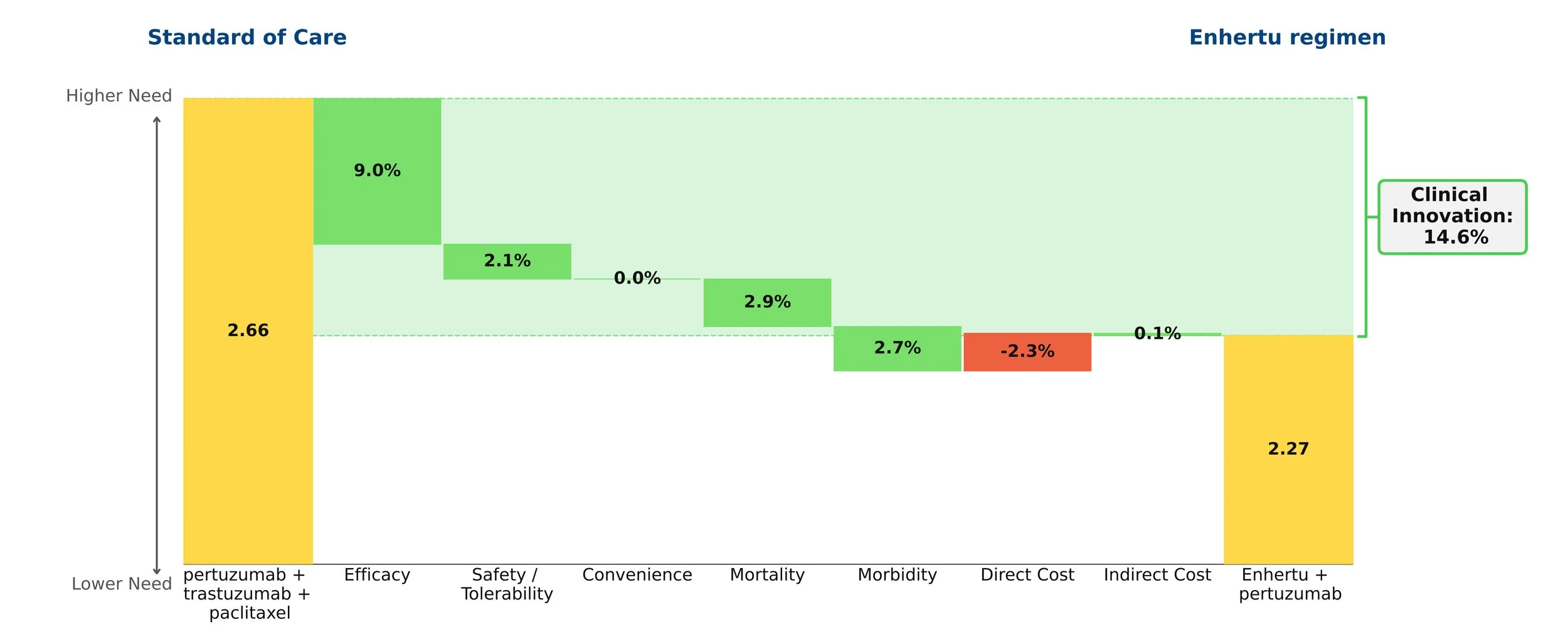 The core of our analysis compares the net clinical improvement of the Enhertu regimen vs. the current standard of care, Perjeta + Herceptin + paclitaxel. Using our rigorous, data-driven methodology, we find that the Enhertu regimen reduces medical need by 14.6%.