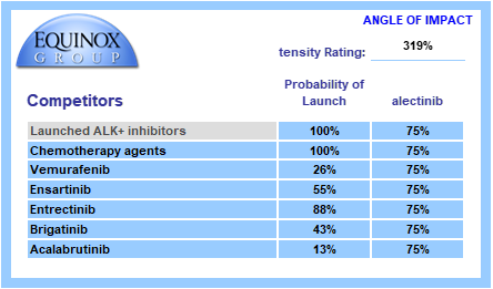 Given a Clinical Innovation score of 23.2% and a competitive intensity rating of 319%, Equinox Group’s regression-validated algorithm projects a peak-year patient share of 60% for alectinib in 1L ALK+ NSCLC.