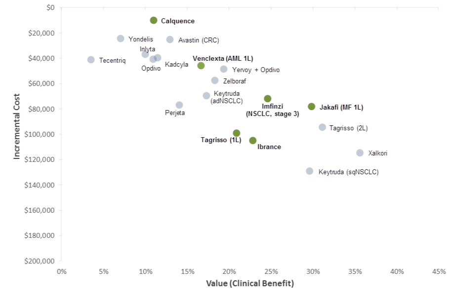 As shown in the clinical characteristics table above, Brukinsa has a marginally better response rate, but an inferior mPFS when compared to up-and-coming Calquence. Equinox’s Unmet Need framework allows us to numerically compare the net clinical advantage/disadvantages these agents offer in this indication.