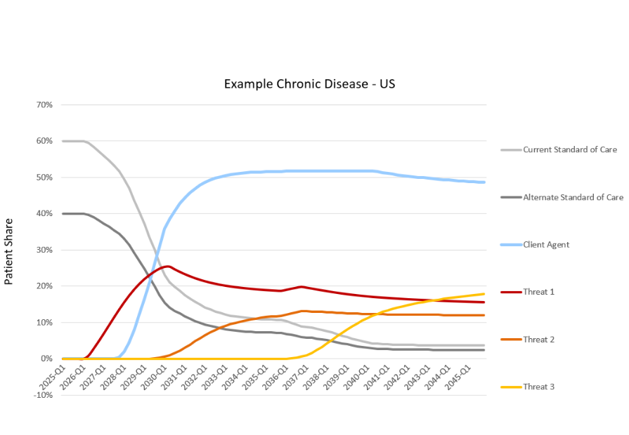 Our forecasting models instantly revise patient share and revenue predictions when fresh information arises about an asset’s clinical attributes and launch date, or as new information emerges about competitors — allowing teams to quickly and authoritatively answer management questions about the impact of events.
